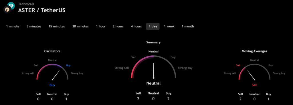 The technical analysis indicators, such as Relative Volume (RVOL), Moving Average (MA), and Relative Strength Index (RSI) of Aster (ASTER) are shown in the chart below.