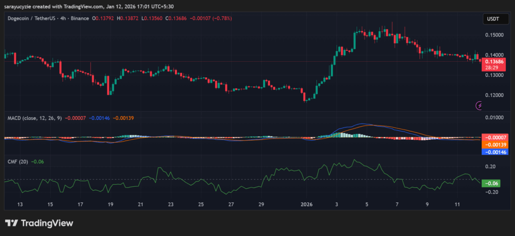 Moreover, the daily Relative Strength Index (RSI) stationed at 37.49 implies bearish to neutral momentum. The meme coin is approaching the oversold territory, where the downside momentum may begin to slow or stabilise. DOGE’s Bull Bear Power (BBP) reading of -0.00371 points to a very weak bearish dominance in the market. As the ongoing momentum is minimal, it has near-balance conditions and a lack of strong direction from either side.
