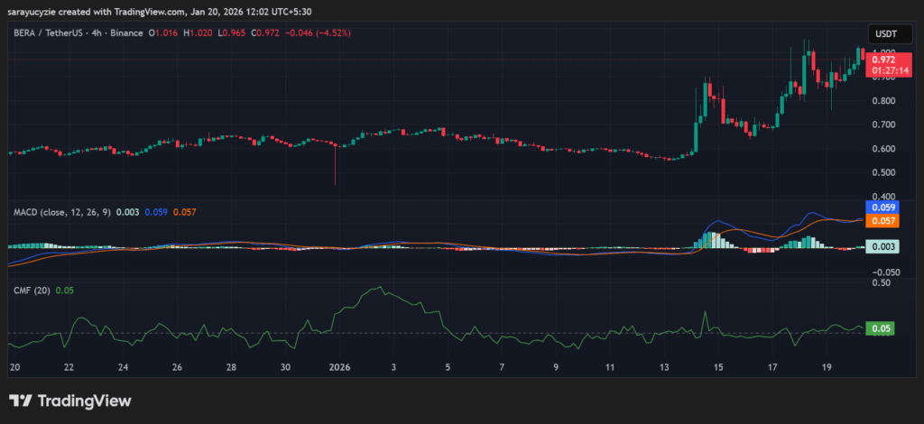 Moreover, the Chaikin Money Flow (CMF) indicator value is resting at 0.05 points toward a mild buying pressure in the BERA market. The capital inflows slightly take precedence over outflows, but the momentum remains weak. It suggests early accumulation, not a strong bullish move.