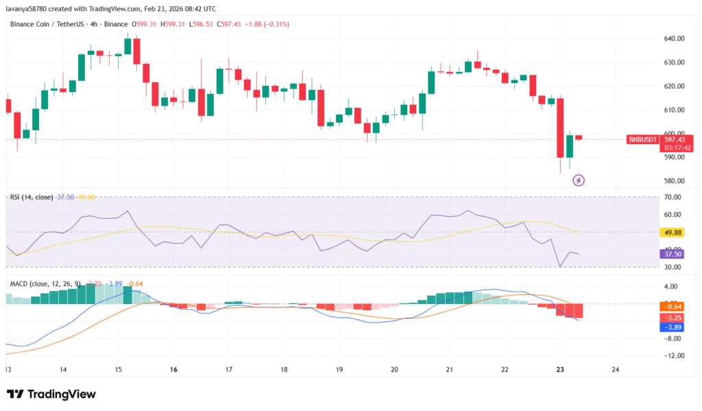 On the 4-hour chart of BNB/USDT, it shows brearish structure persists with a red candle forming. The price could see the immediate support at $590, or if further deep corrections happen, the price might go below and touch the $585 – $580 range. On the upside, if BNB reverses, the price could push up to the $613, the previously marked resistance level. If the bulls take charge, it might push up $620 or even higher.