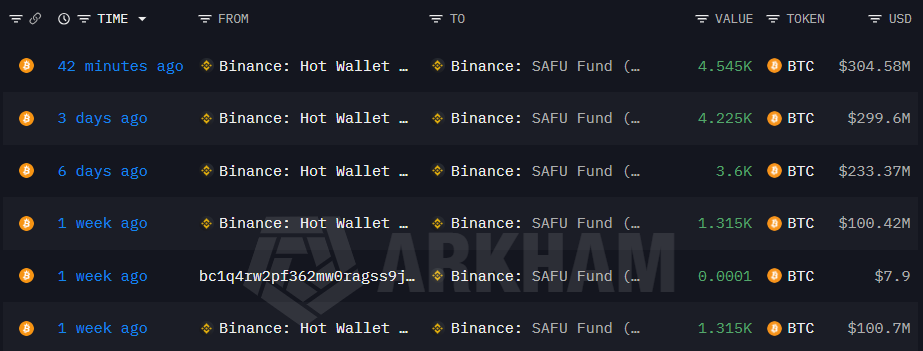 Earlier in the month, Binance moved 1,315 BTC (about $100 million) into the SAFU wallet as part of the initial stages of the conversion plan. In the following days, the fund received additional tranches including 3,600 BTC (about $233 million) and 4,225 BTC (about $299.6 million), increasing the reserve’s Bitcoin balance.