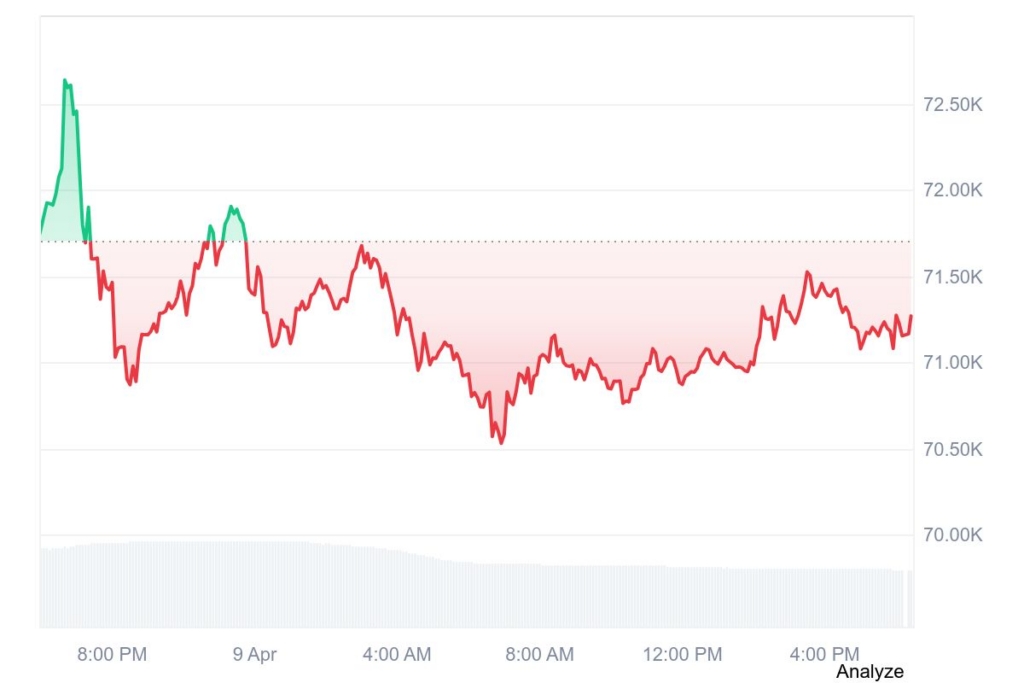 Investors bought around 386,100 BTC over the last three months, and the bullish argument for BTC currently rests on breaking over a sell wall between $72,000 and $73,000. It has to break past the $73,000 sell wall before it can keep climbing to $75,000. At the time of writing, Bitcoin is trading at $71,251, down 1.24% in the last 24 hours as per data from CMC.