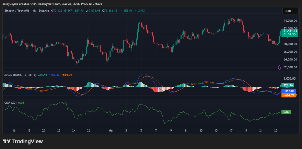 In addition, the Chaikin Money Flow (CMF) indicator at 0.03 shows slight buying pressure in the BTC market. More money is flowing in, but it is not strong. Buyers have a small edge, yet the market is indecisive. This points to sideways movement with a mild upward bias, unless buying strength increases.