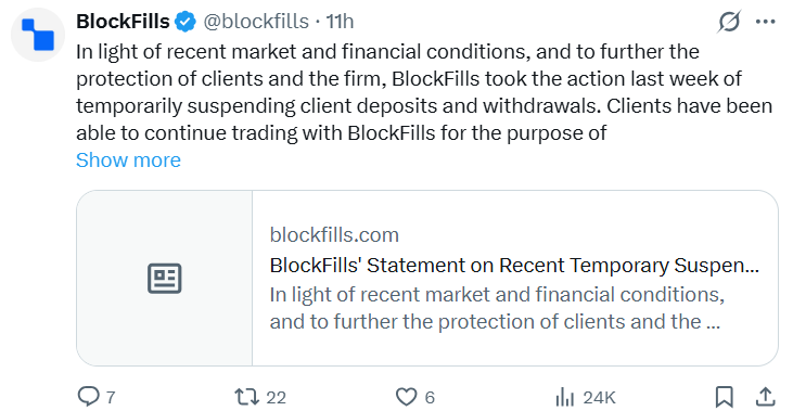 - BlockFills paused deposits and withdrawals, but users can still trade.