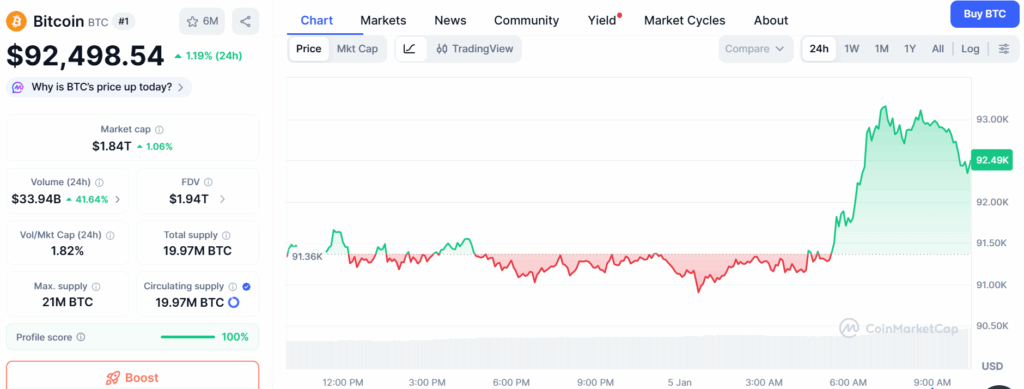 Prices of BTC and ETH have crossed the crucial milestones. BTC is trading at $92,498.54, up by 1.19% over the last 24 hours and 2.81% in a week. A $90k mark was set up as one of the testing zones for the flagship cryptocurrency, terming it as a potential kick for a bull run. Bitcoin price has surged along with a rise of 1.42% in the global crypto market cap, which now stands at more than $3 trillion.