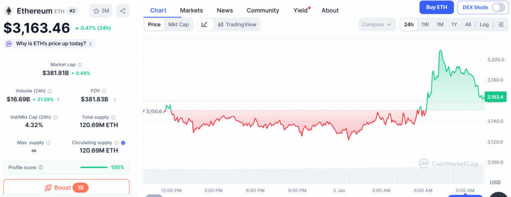 A crucial zone for ETH was defined at $3k. It is now exchanging hands at $3,163.43, up by 0.47% over the last 24 hours and 4.25% over the last 7 days. Its individual market cap has surged by 0.2% with an uptick of 35.47% in the 24-hour trading volume.