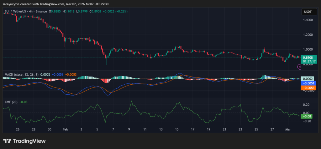 Besides, the indicator that assesses the capital flow, the Chaikin Money Flow (CMF), is at -0.08, implying moderate selling pressure for SUI. The capital outflow is slightly outweighing the inflow. The negative value hints at distribution, and if it falls further, it confirms a stronger bearish pressure.