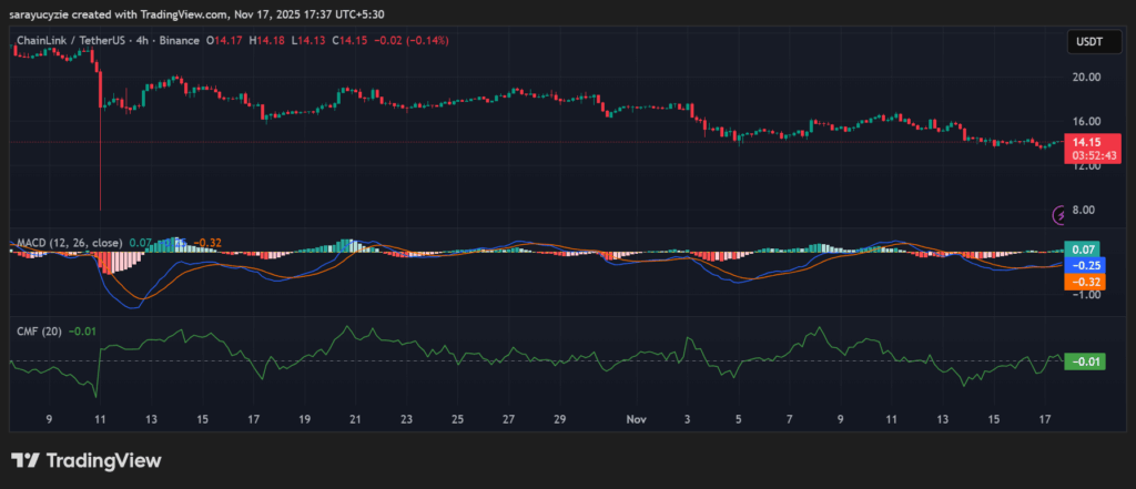 The Moving Average Convergence Divergence (MACD) and signal lines of Chainlink are found below the zero line, which implies the current bearish trend. It is the short-term weakness, but further downside is likely. Moreover, LINK’s Chaikin Money Flow (CMF) indicator at -0.01 shows minimal selling pressure in the market, almost neutral. With the negative value, the money is flowing out than in, not a strong downtrend.