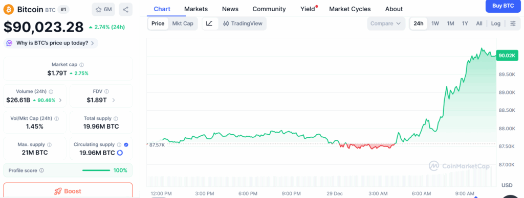 The global crypto market cap briefly surpassed the $3 trillion milestone. This was possibly triggered by the rising interest in tokens like BTC and ETH. Bitcoin price went as high as $90,023.28, up by 2.74% in the last 24 hours, to reclaim the $90k milestone. The token is now projected to surge by 16.99% in the next 3 months to reach around $103,282.