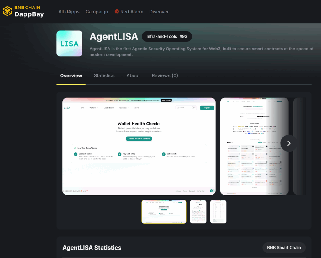 - BNB Chain DappBay: dappbay.bnbchain.org/detail/agentlisa