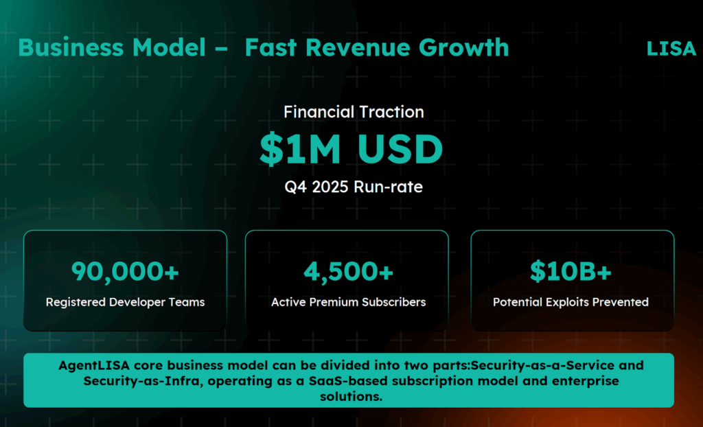2. AgentLISA Validated the Solution: Already operational in production with $7.3M+ in prevented exploits, 90,000+ developer teams, 4,000+ premium subscribers generating $1M+ annualized revenue.