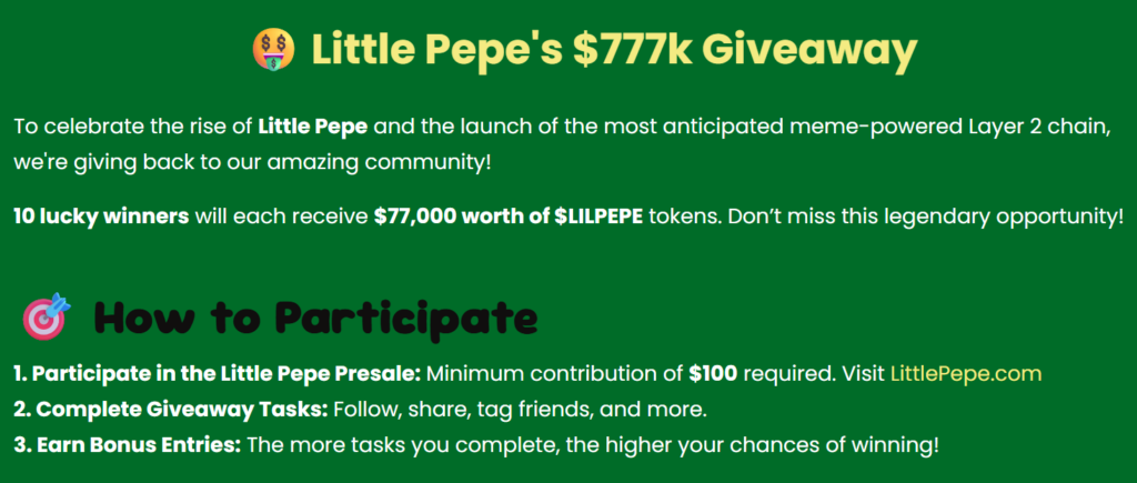 Community participation has played a major role in the project’s rapid growth. The ongoing $777,000 giveaway has added a strong incentive layer, offering 10 winners $77,000 worth of LILPEPE tokens each. Entry requires a minimum $100 presale contribution along with completion of community-driven tasks.