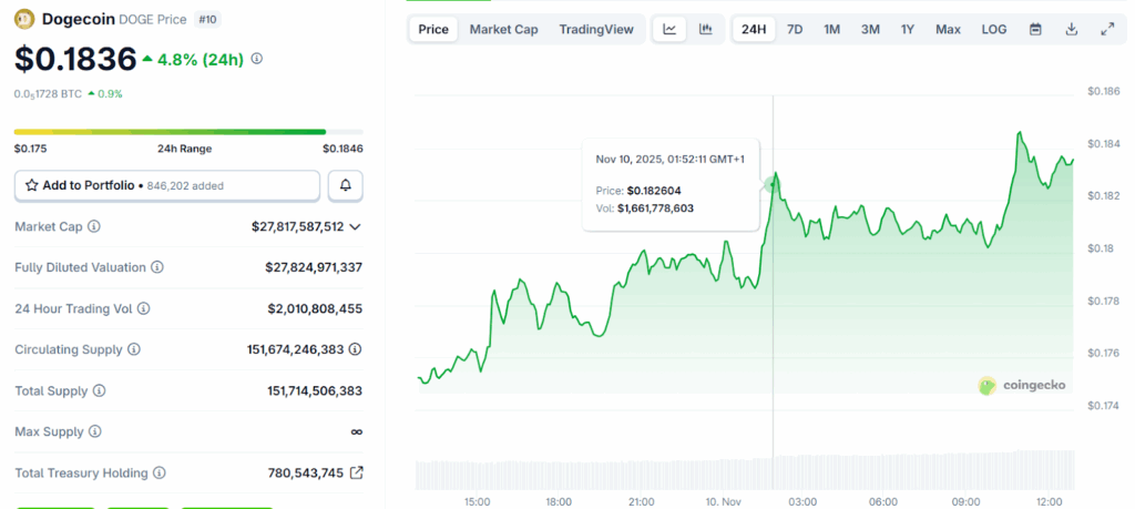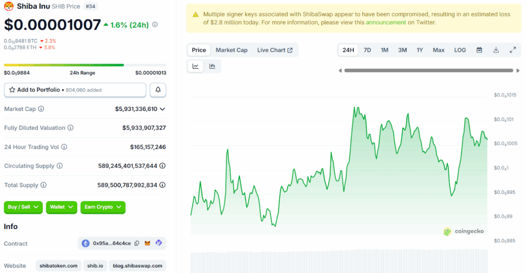 The SHIB chart has also turned green with a 1.6% daily gain. The token has recovered the $0.00001 resistance level, a psychological demand zone. Should the momentum hold, the next critical barrier is at $0.0000125.