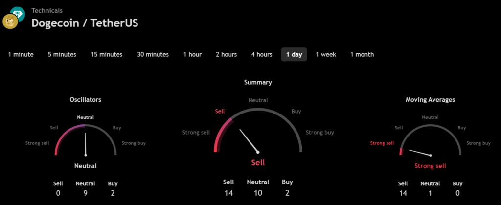 The technical analysis indicators such as Relative Volume (RVOL), Moving Average (MA), and Relative Strength Index (RSI) of Dogecoin (DOGE) are shown in the chart below.