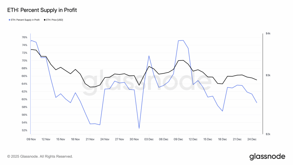 December brought continued volatility for Ethereum. Despite briefly reclaiming the $3,000 price level, ETH failed to maintain support above this threshold and has since fallen back below it. The weakness has directly impacted holder profitability across the network.