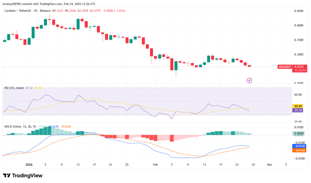 Cardano is also caught in the market’s downward momentum, which is trading at $0.2573, down 5.11% in the last 24 hours. Meanwhile, the daily trading volume has increased slightly by around 3%. But, ADA crypto is still down around 8% over the past week and 28% down over a month. Also, altcoin is nearly 91% down from its peak of $3.10.