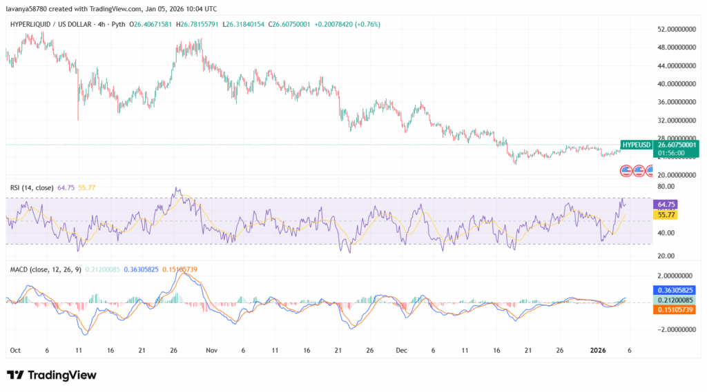From a technical point of view, HYPE is attempting to stabilize on the 4-hour chart after an extended downtrend, with price consolidating around the $25–26 zone. With that, RSI is moving above 60s, signaling growing buyer interest without entering overbought territory. Also, the MACD shows positive crossover, these indicators point towards a relief rally.