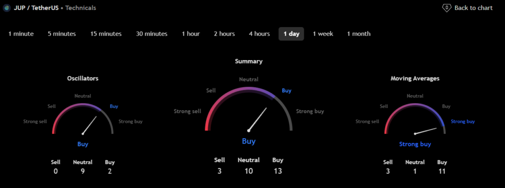 The technical analysis indicators, such as Relative Volume (RVOL), Moving Average (MA), and Relative Strength Index (RSI) of Jupiter (JUP), are shown in the chart below.