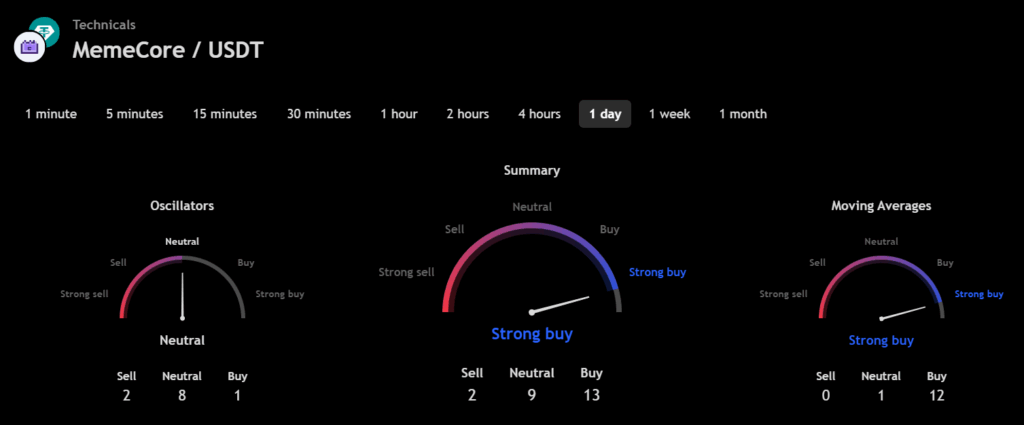 The technical analysis indicators, such as Relative Volume (RVOL), Moving Average (MA), and Relative Strength Index (RSI) of MemeCore (M) are shown in the chart below.