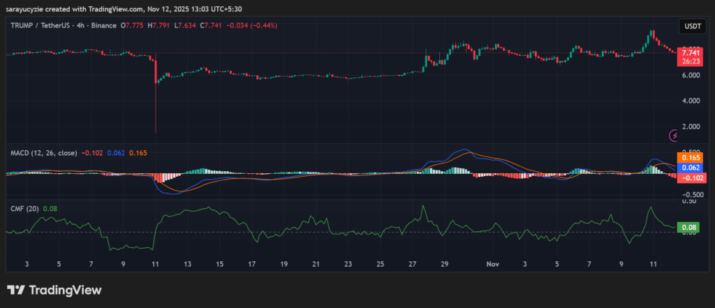 Moreover, the Chaikin Money Flow indicator is worth noting, found at 0.08, suggesting mild buying pressure in the TRUMP market. As the value is above zero, the money is flowing into the asset, but the momentum is not very strong. A higher CMF value would confirm stronger accumulation.