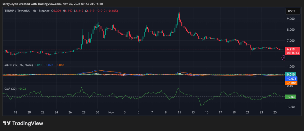According to the CoinMarketCap data, the OFFICIAL TRUMP is trading at around the $6.20 zone at the time of writing. Besides, with the market cap settling at $1.26 billion, the daily trading volume of TRUMP has spiked by over 2%, reaching the $292.19 million mark.