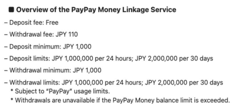 You can move money in and out with one tap once you link the two apps and finish KYC on both. Deposits are free right now, withdrawals cost a flat 110 yen (about 60 cents), and the limits are 1 million yen a day or 2 million yen a month. Even tiny amounts from 1,000 yen (around $6.50) work, and it’s 24/7.