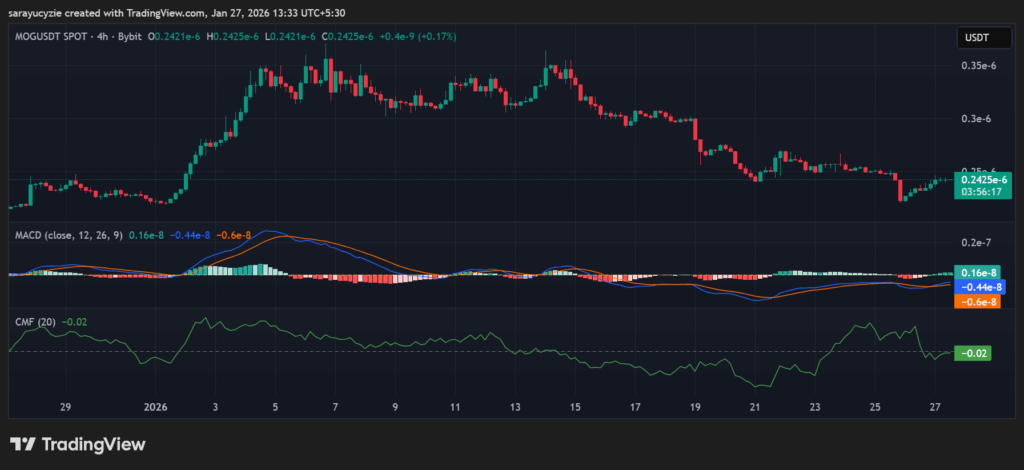 In addition, the Chaikin Money Flow (CMF) indicator at -0.02 points to a slight negative money flow into the MOG market. More capital is moving out, but the pressure is weak, not aggressive. There is a mild selling interest rather than a strong bearish market confidence.