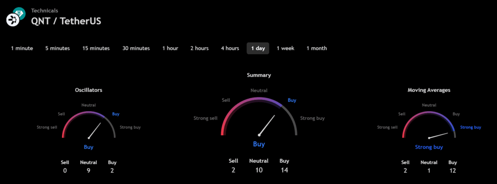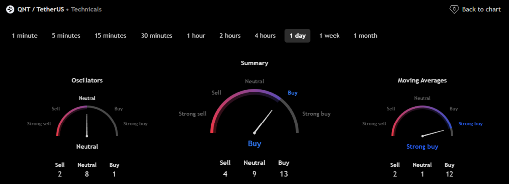 The technical analysis indicators such as Relative Volume (RVOL), Moving Average (MA), and Relative Strength Index (RSI) of Quant (QNT) are shown in the chart below.