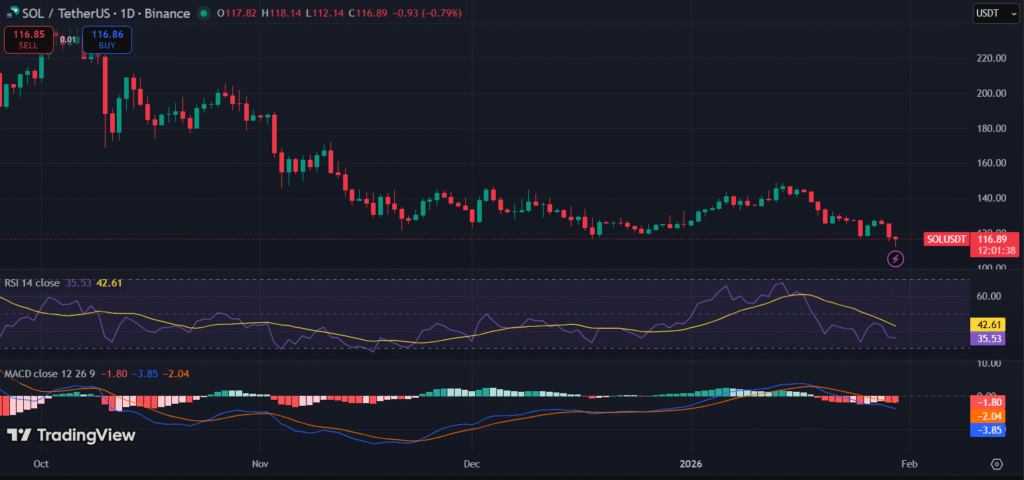 - Solana (SOL) is trading near $116.84, pressured by overall crypto market weakness despite high trading volume.