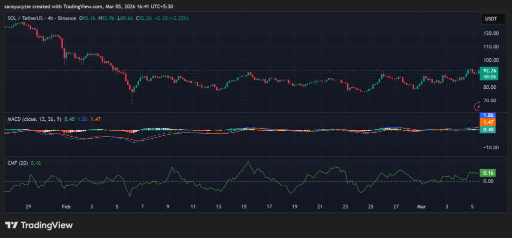 SOL’s Chaikin Money Flow (CMF) indicator is located at 0.16 shows moderate buying pressure. The capital is flowing into the asset, supporting the current price movement. It reflects improving market sentiment and steady demand in the market.
