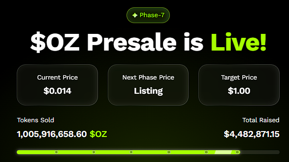 Ozak AI (OZ) is leading the next evolution of blockchain technology, combining artificial intelligence, predictive analytics, and decentralized data automation into one powerful ecosystem. Currently in its 5th OZ presale stage at $0.0014, Ozak AI has already raised over $4.4 million and sold more than 1 billion tokens, signaling massive early demand from investors seeking the next major growth catalyst in crypto.