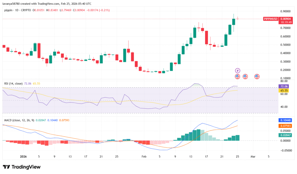 The daily chart of PIPPIN shows strong bullish momentum over the past two weeks, after early February lows near $0.18–$0.20, and is now trading around $0.80. With that, the nearby resistance is placed near the recent high around $0.84 – $0.85, a decisive breakout above this zone could reach the $0.90 level. On the downside, immediate support is seen around $0.75, followed by a stronger support zone near $0.65.