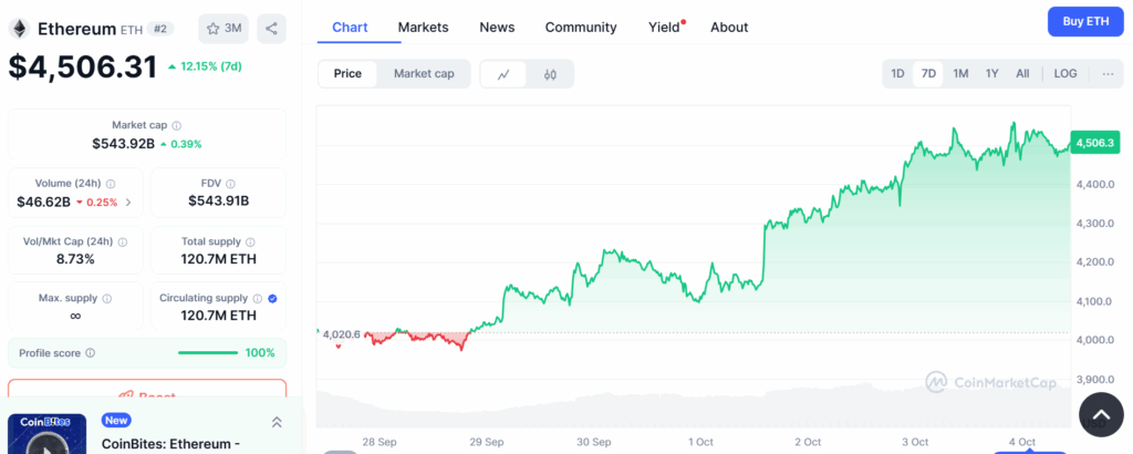 ETH price has recorded larger gains during the same time window. The token’s price is up by 12.15%, taking the value to $4,506.31. Tides turned for ETH price simultaneously on September 29, 2025. Ether has only recorded green trades since then, with the highest exchange value of $4,558.63, which remained on the charts for a few moments.