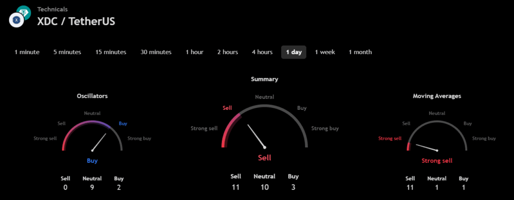 The technical analysis indicators such as Relative Volume (RVOL), Moving Average (MA), and Relative Strength Index (RSI) of XDC Network (XDC) are shown in the chart below.