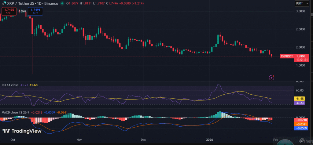 - XRP has slipped below $1.75 as broader crypto market weakness and Bitcoin’s decline continue to pressure altcoins.